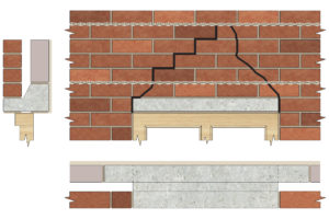 The Helifix Helibeam system overcomes all these difficulties by using the existing masonry. It is quick, simple, reliable, economical and non-disruptive. Mortar beds are channelled-out at two levels above each window and pairs of stainless steel Helifix HeliBars are bonded into the slots with Helifix HeliBond cementitious grout. A deep masonry beam is formed above the window which supports the masonry and spreads the structural loads. Generally, Helifix DryFix remedial ties or grouted Helifix CemTies are then installed vertically up through the brickwork and into the new masonry beam to secure the existing lintel. No mechanical supports are required and the existing window frame can be removed and replaced without fear of the masonry moving.