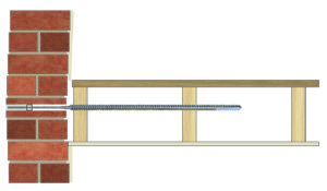 Helifix BowTie HDs are inserted through clearance holes in the masonry and are power-driven through the first and second joist (and third, if required) before the outer end is bonded into the masonry with Helifix PolyPlus resin.