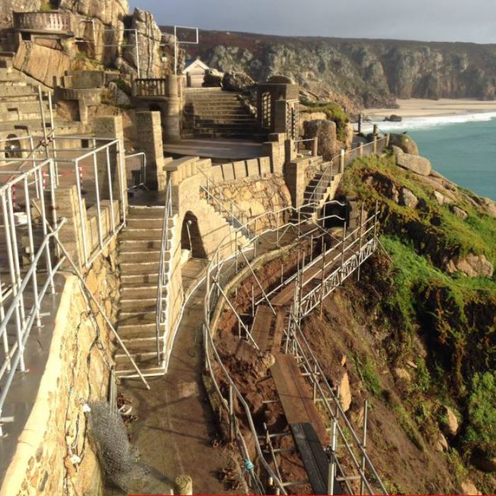 Providing a dramatic backdrop to performances, the Minack Theatre is a 700 seat open air amphitheatre carved into the cliff face near to Lands End. An exposed walkway running along the cliff edge, used by actors to reach the stage, needed to be upgraded, widened and new handrails installed. Piles had been specified as the means of support for the widened pathway, which was to be formed from concrete, and to tie it back into the rock face. However, the cost of the scaffolding and support structures required to enable a traditional piling system to be used would have cost many thousands of pounds. An effective but more economical method needed to be found.