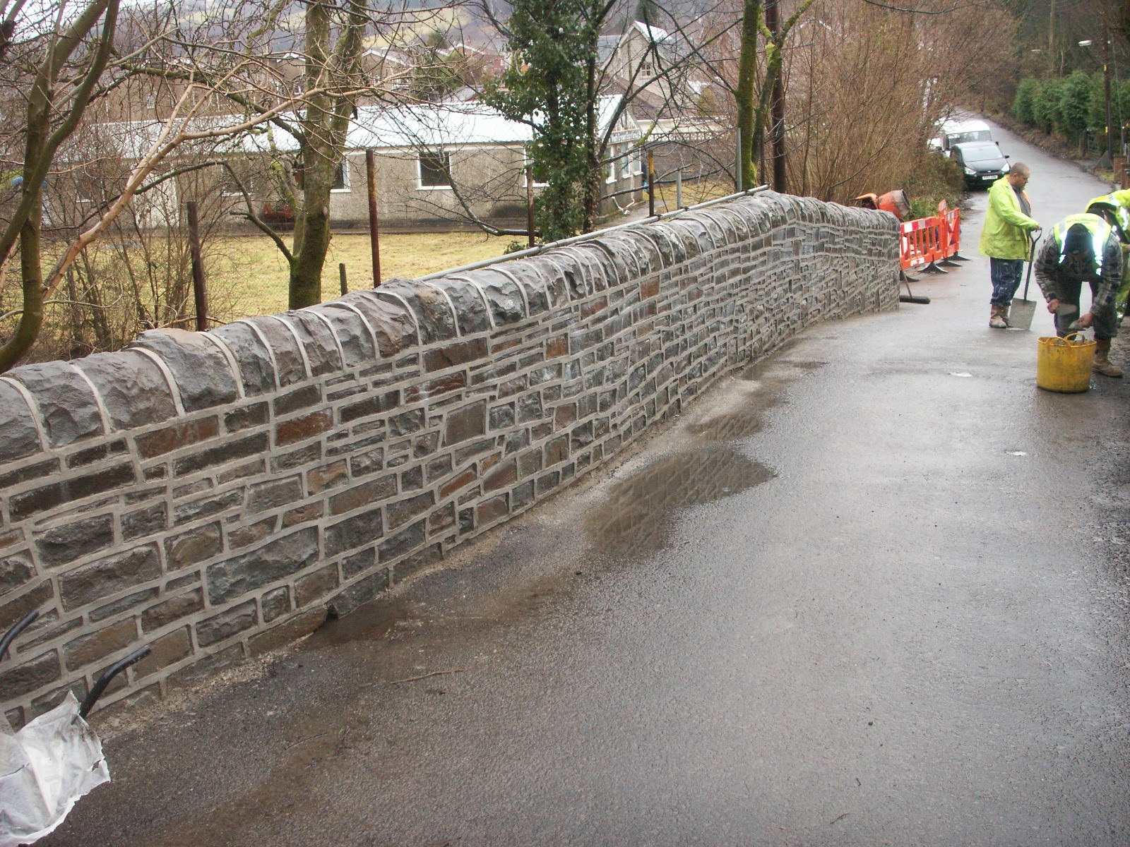 This natural stone bridge with 480mm thick masonry parapet walls carries the Maes Mawr Road over the Dulais waterway and has a 10.57m span with a 3.9m central rise. The carriageway cover on the arch of the crown, including surfacing, is 100mm.